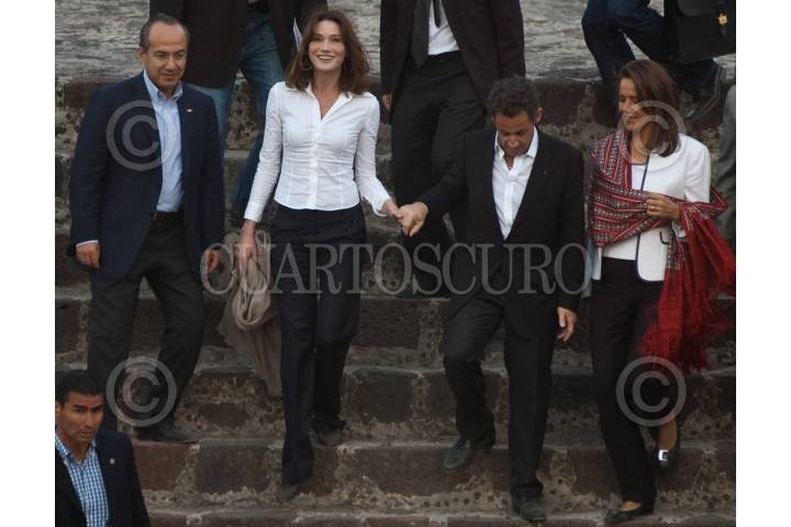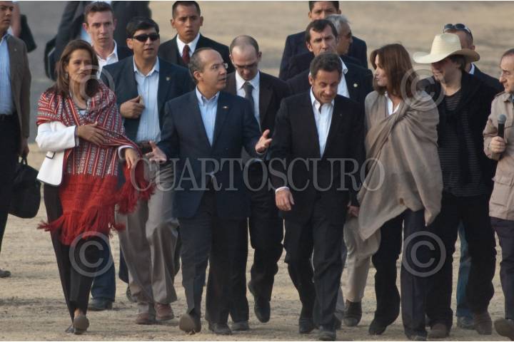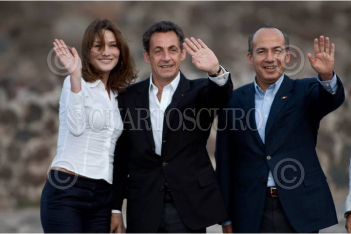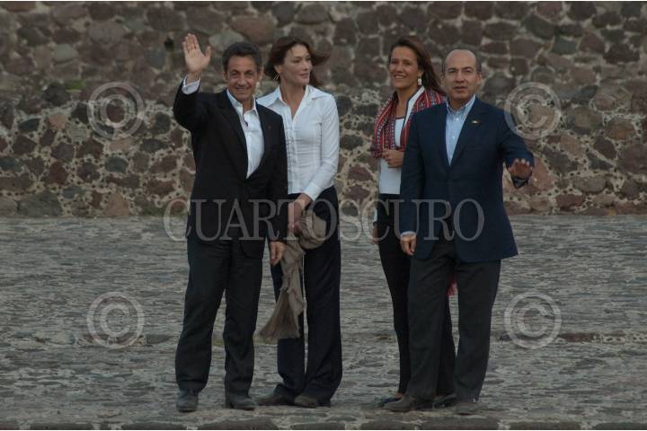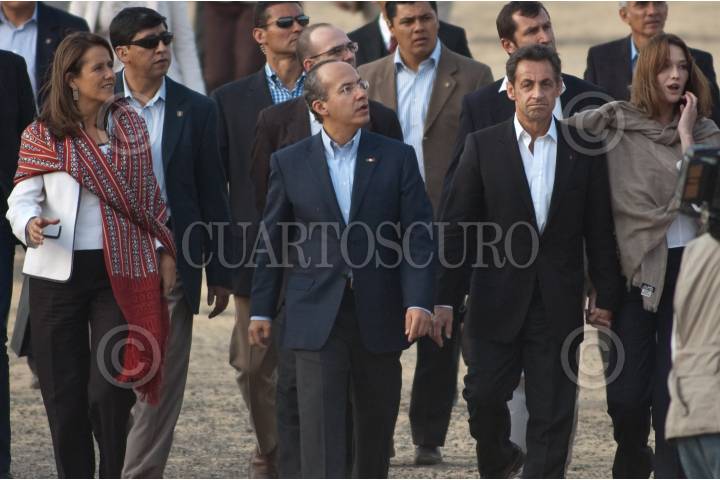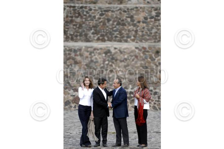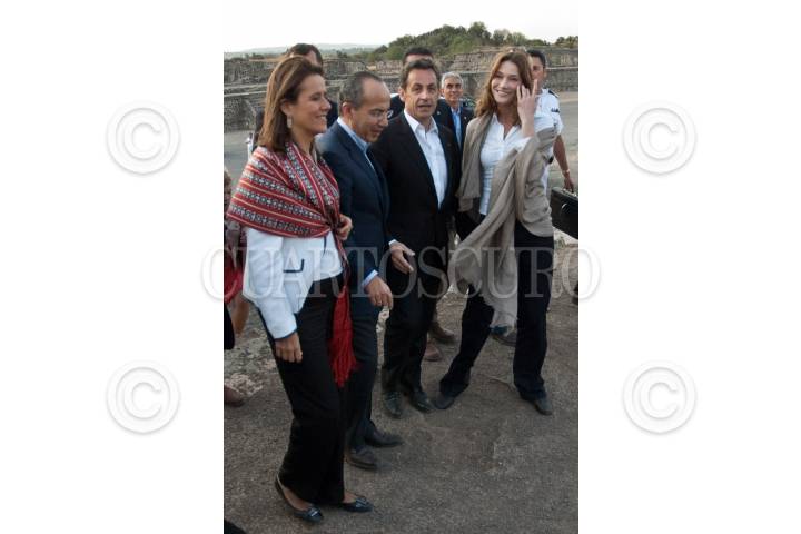 TEOTIHUACÁN, ESTADO DE MÉXICO, 08MARZO2009.- El presidente de México Felipe Calderón acompañado de su esposa Margarita Zavala y su homologo francés Nicolas Sarkozy acompañado de su esposa Carla Bruni a su llegada a la zona arqueológica de Teotihuacan en donde admiraron la pirámide del sol. FOTO: RODOLFO ANGULO/CUARTOSCURO.COM