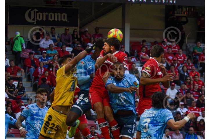 TOLUCA, ESTADO DE MÉXICO, 29MARZO2025.- Bruno Mendez defensa de los Diablos de Toluca y Carlos Moreno portero de los Tuzos de Pachuca, en el partido correspondiente a la jornada 13 del Torneo Clausura 2025 de la Liga MX, con un marcador final 3-2. FOTO: CRISANTA ESPINOSA AGUILAR /CUARTOSCURO.COM
