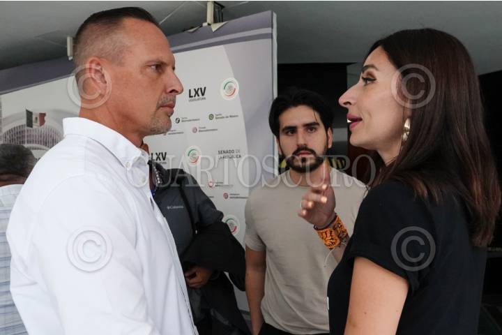 CIUDAD DE MÉXICO, 17ABRIL2024.- El activista Bryan LeBarón conversa con la senadora de MC Laura Ballesteros tras una conferencia en la Cámara de Senadores. FOTO: GALO CAÑAS/CUARTOSCURO.COM