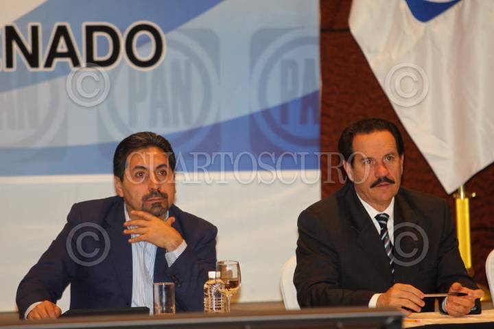 MÉXICO, D.F., 27ENERO2010.- Los senadores Ruben Camarillo y Juan Bueno Torio durante la reunión plenaria del Grupo Parlamentario del Partido Acción Nacional (PAN) en el Senado de la República que se realiza en un hotel del Paseo de la Reforma. FOTO: RODOLFO ANGULO/CUARTOSCURO.COM