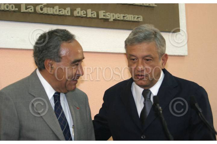 MEXICO, D.F. 06JUNIO2005.- César Buenrostro Hernández, Secretario de Obras y Servicios del D.F. y Andrés Manuel López Obrador, jefe de gobierno de la ciudad de México, durante la conferencia que ofreció a los medios de comunicación. FOTO: Nelly Salas/CUARTOSCURO.COM