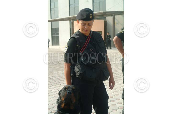 México D.F 29 Marzo 2004.- Una custodia del nuevo Centro Femenil de Readaptación Social en Santa Martha Acatitla acaricia a su perro durante la ceremonia de inauguración. FOTO: Eunice Adorno/CUARTOSCURO.COM