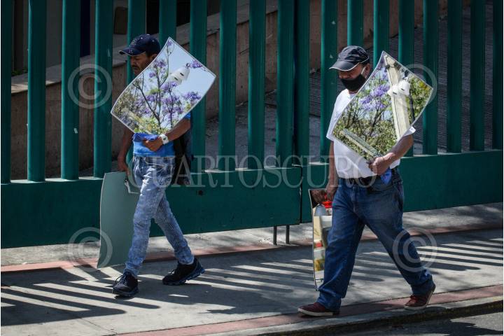 Dos vendedores de espejos caminan sobre la calle Dr. Márquez.