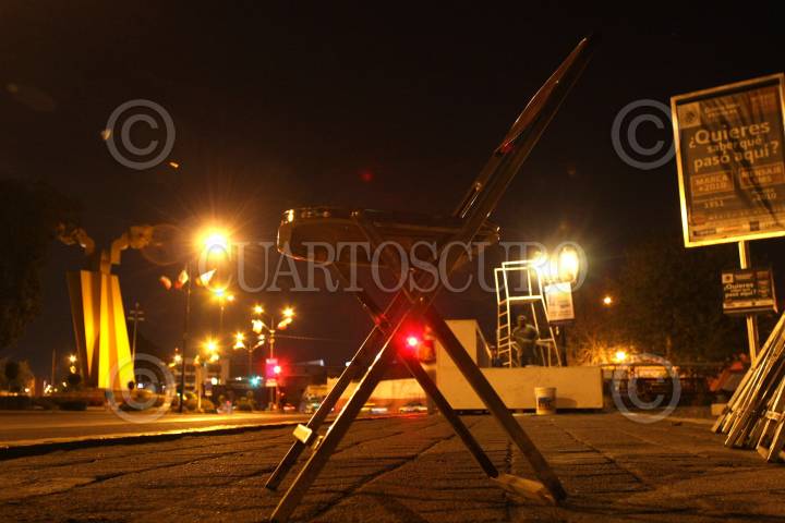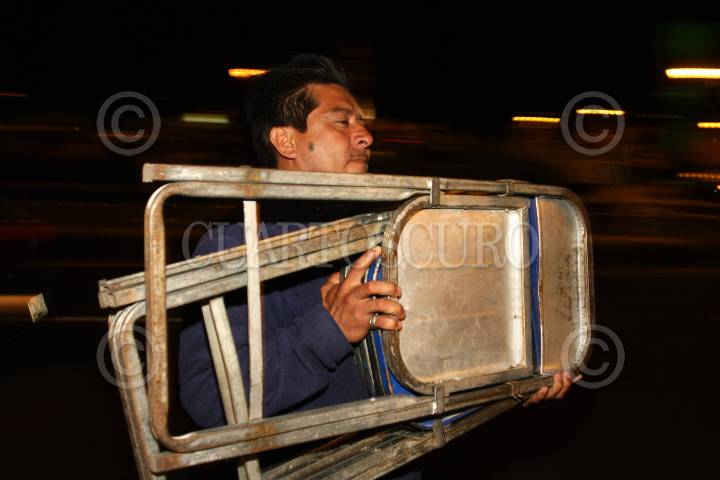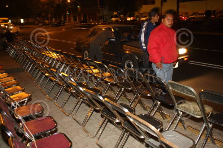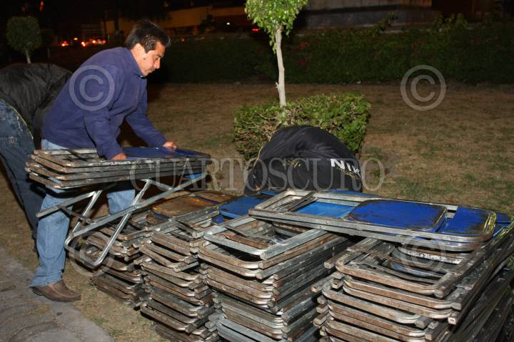 PUEBLA, PUEBLA, 04MAYO2011.- Con una noche previa al desfile conmemorativo de la batalla de Puebla, vecinos del barrio de Analco, realizaron la instalación de sillas a lo largo del bulevar Héroes del 5 de mayo, para su renta a las personas que deseen observar el espectáculo. La ocupación de cada asiento oscila de los 50 hasta los 200 pesos y cada familia del barrio a laborado en el negocio de las rentas por más de 20 años. FOTO: FRANCISCO GUASCO/CUARTOSCURO.COM