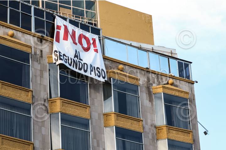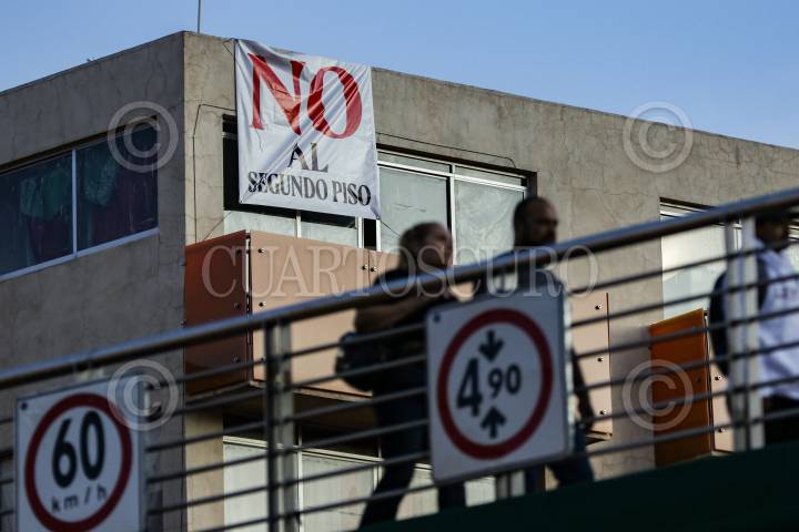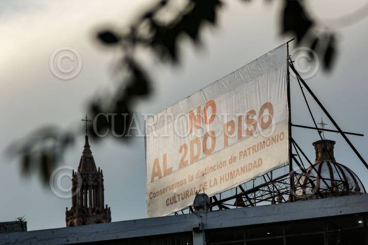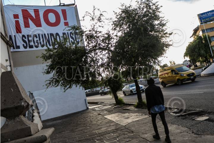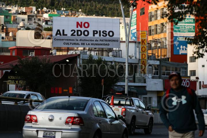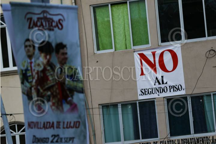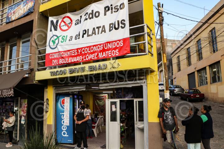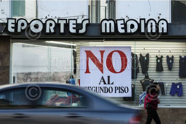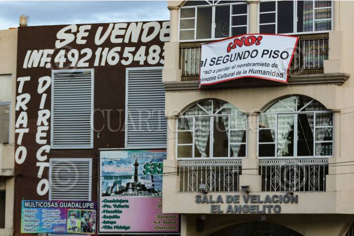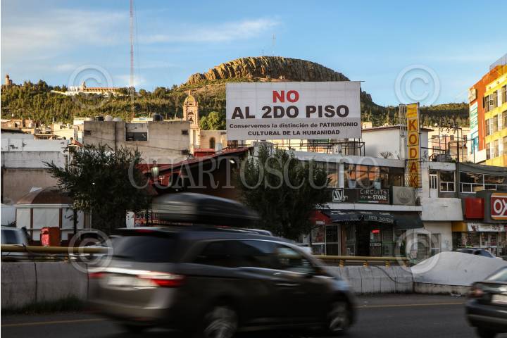 ZACATECAS, ZACATECAS, 17AGOSTO2024.- Mantas de diferentes tamaños en contra del segundo piso se pueden observar en negocios y comercios sobre el bulevar Adolfo López Mateos, en la zona del centro histórico. El segundo piso del bulevar metropolitano, obra insignia del gobernador David Monreal Ávila, se ha convertido también en el proyecto de infraestructura más cuestionado de los últimos años debido a su impacto cultural y económico. La vialidad de 3.3 kilómetros de longitud, 10 metros de altura y con un costo de tres mil 600 millones de pesos, se ubicará en la vía más transitada de la capital del estado, al limite de la zona declarada Patrimonio Cultural de la Humanidad lo que modificaría el paisaje poniendo en riesgo dicha declaratoria concedida por la UNESCO hace 30 años. FOTO: ADOLFO VLADIMIR /CUARTOSCURO.COM