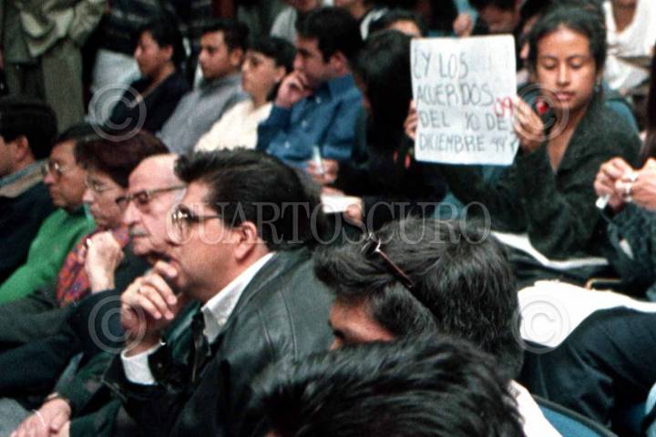 Ignacio Burgoa Origuela (izq) eschuca los gritos de " presos politicos libertad " que entonaban los integrantes del CGH ademas portar carteles. La conferencia se tuvo que suspender.