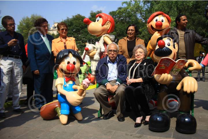 MÉXICO,D.F., 09NOVIEMBRE2008 .- Guadalupe Appenini de Vargas y Carlos Monsivais encabezaron la exposicion de las esculturas de la "Familia Burron" creada por Gabriel Vargas, que estará situada en Alameda Central para el disfrute de la sociedad en general, siendo estas estatuíllas de tamaño natural estarán situadas en una banca donde la gente tendrá espacio de sentarse y tomarse una fotografia con esta famosa familia. Los Artistas encargados de recrear a la familia en tamaño natural fueron Juan Carlos Siles y Raul Garcia de la compañía ESKELOS. FOTO: COSME RADA/CUARTOSCURO.COM