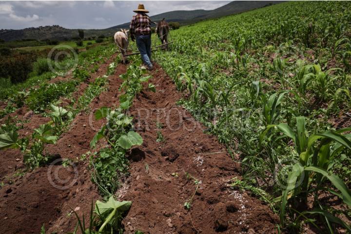 FRESNILLO, ZACATECAS, 20JULIO2025.- Eleopoldo Moreno y su hijo trabajan la milpa con yunta de burros en la comunidad de “El Angelito”. A pesar del avance de la tecnología agrícola, algunos campesinos de temporal siguen utilizando métodos tradicionales, como la yunta, por su precisión en el trazo de los surcos y la conservación de la tierra. El uso de la yunta, generalmente compuesta por burros, bueyes o mulas, permite abrir surcos rectos y bien definidos, lo cual facilita la siembra y el desarrollo parejo del cultivo, además de permitir una mejor captación de agua de lluvia. Este sistema también reduce la compactación del suelo, a diferencia de los tractores, y representa un ahorro económico en comunidades rurales donde el acceso a maquinaria moderna es limitado o costoso. Tras las lluvias recientes y con parte de la milpa ya sembrada, Eleopoldo y su hijo repasan los surcos para eliminar maleza y asegurar que los cultivos, principalmente maíz, frijol y calabaza, crezcan en condiciones óptimas. Este trabajo, aunque físicamente demandante, es parte fundamental del calendario agrícola de temporal, donde se depende completamente del ciclo de lluvias para lograr una buena cosecha. La siembra con yunta es más que una técnica: es una herencia cultural que refleja el vínculo profundo entre las familias campesinas y la tierra que trabajan. FOTO: ADOLFO VLADIMIR /CUARTOSCURO.COM