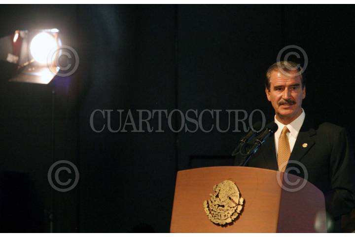 MEXICO, D.F., 25ABRIL2005.- Vicente Fox Quesada, presidente de la República, durante su discurso en la comida del 25 Aniversario de la Asociación Mexicana de Intermediarios Bursatiles, A.C., en un hotel de la capital. FOTO: Moisés Pablo/CUARTOSCURO.COM