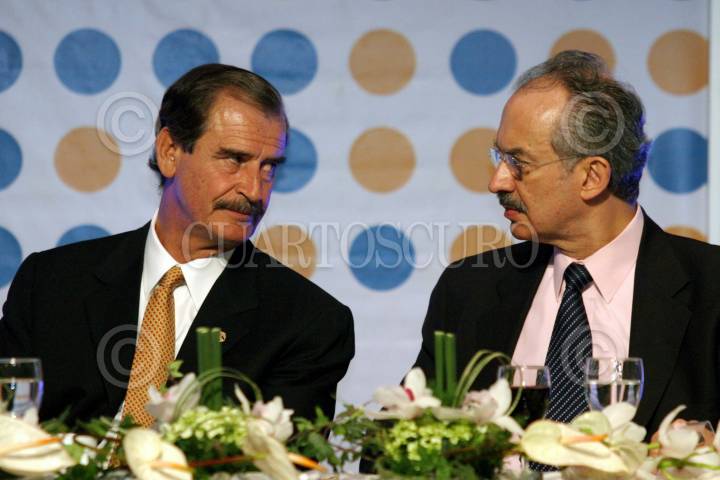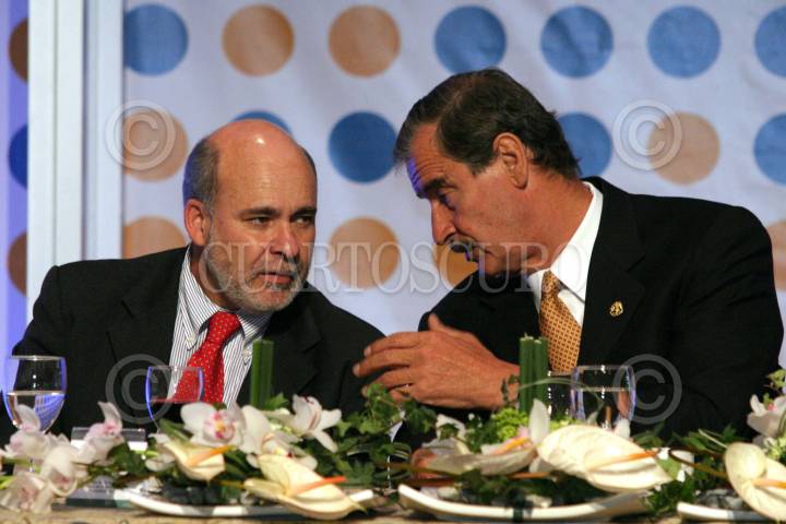 MEXICO, D.F., 25ABRIL2005.- Vicente Fox Quesada, presidente de la República y Francisco Gil Díaz, Secretario de Hacienda y Crédito Público, durante la comida del 25 Aniversario de la Asociación Mexicana de Intermediarios Bursatiles, A.C., en un hotel de la capital. FOTO: Moisés Pablo/CUARTOSCURO.COM