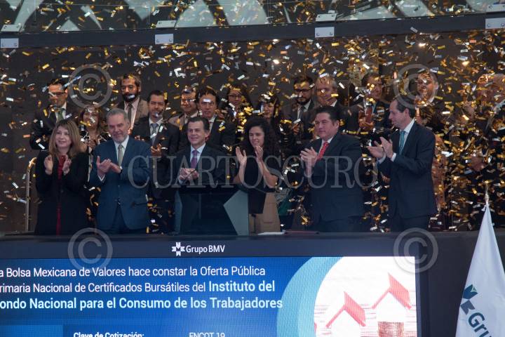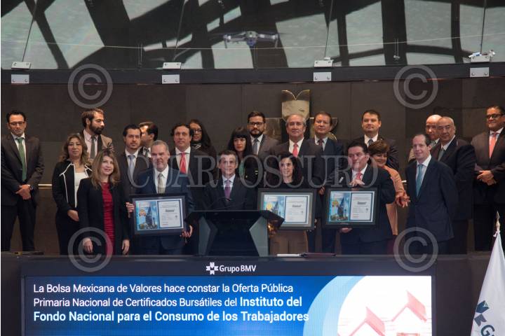 CIUDAD DE MÉXICO, 06NOVIEMBRE2019.- Alberto Ortíz Bolaños, director general de FONACOT; Luisa María Alcalde Luján, secretaria de Trabajo y Previsión Social y José Oriol Bosch Par, director general de la Bolsa Mexicana de Valores (BMV), encabezaron la ceremonia con motivo de la Colocación de Certificados Bursátiles del Instituto Fonacot. FOTO: MARIO JASSO /CUARTOSCURO.COM