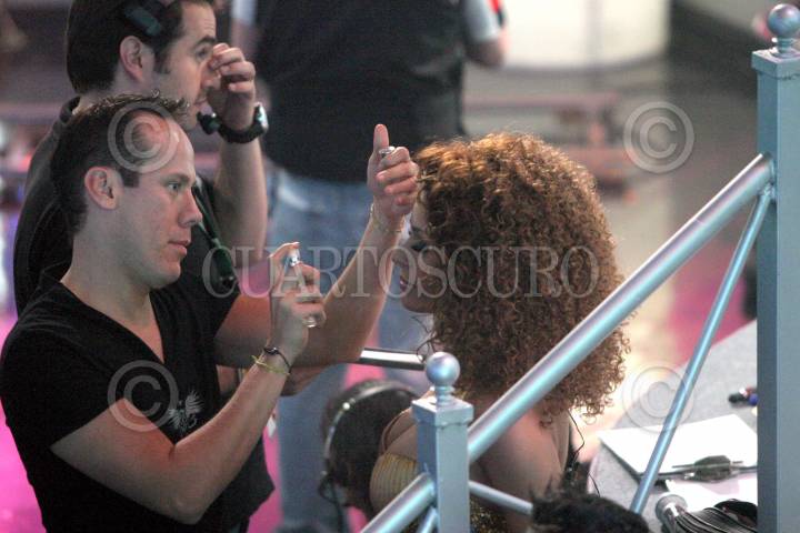 MÉXICO, D.F., 30SEPTIEMBRE2007.- Un maquillista arregla detras de camara a la conductora Galilea Montijo durante el programa "Buscando a Timbiriche la Nueva Banda". FOTO: SAÚL LÓPEZ/CUARTOSCURO.COM