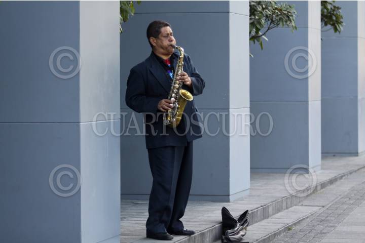 MEXICO, D.F., 31DICIEMBRE2010.- Un músico toca su saxofón en calles de la ciudad en este último día del año para ganarse algunas monedas. De acuerdo al gobierno federal se han creado miles de nuevos empleos en México, aunque miles de personas tienen que emplearse en la economía informal o buscando otras formas de ingreso ya que los empleos formales son temporales o no son muy bien pagados. FOTO: RODOLFO ANGULO/CUARTOSCURO.COM