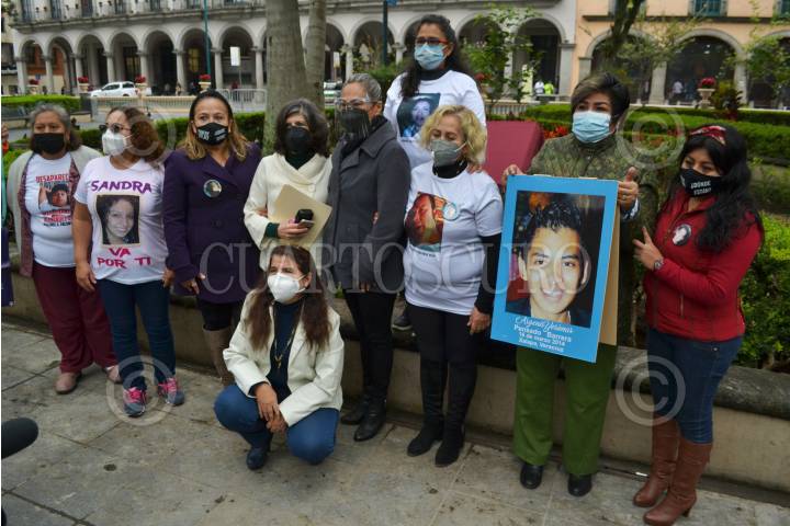 Integrantes de colectivos que buscan a sus familiares desaparecidos develaron una placa grabada con los nombres de sus seres queridos, en el Parque Juárez, Xalapa.