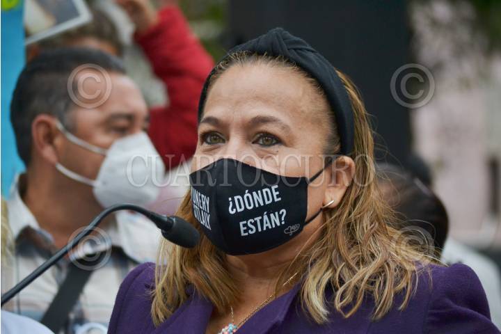 Victoria Delgadillo, quien busca a su hija Yunery Citlally Hernández Delgadillo, durante la inauguración de una placa grabada con nombres de personas desaparecidas, que fue colocada en el Parque Juárez.