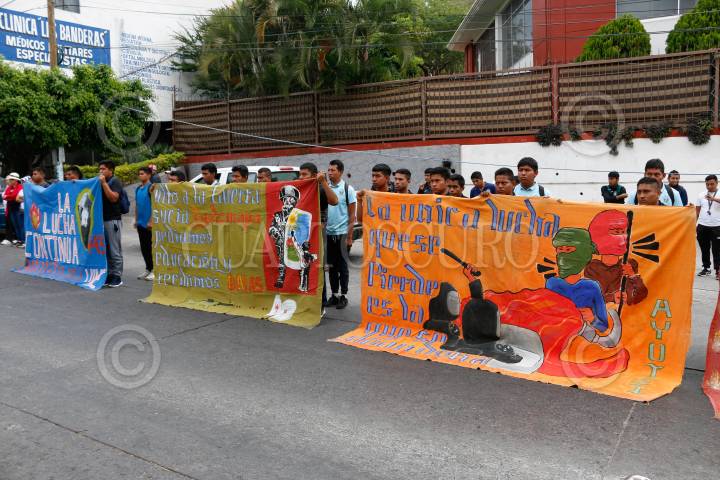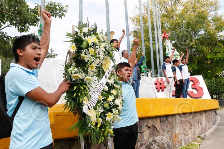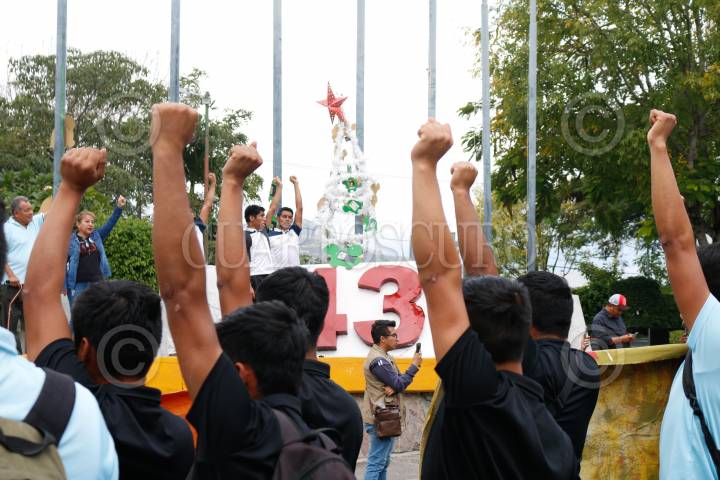 CHILPANCINGO, GUERRERO, 26DICIEMBRE2023.- Estudiantes de la Escuela Normal Rural ‘Raúl isidro Burgos’ de Ayotzinapa realizaron un mitin político para conmemorar 111 meses de la desaparición de los 43 en Iguala, los estudiantes reprocharon al gobierno federal que hasta el momento no de una respuesta clara por este crimen de estado. Los jóvenes estuvieron acompañados por integrantes del Colectivo de Desaparecidos ‘Lupita Rodríguez Narciso’.