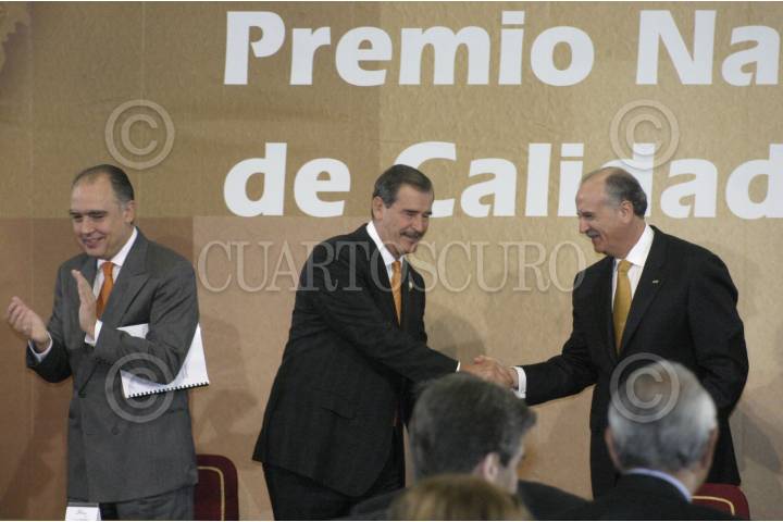MEXICO, D.F. 09DICIEMBRE2004.- Fernando Canales Clariónd, Secretario de Economía, Vicente Fox Quesada, presidente de México, y Alberto Bustani, Rector de la zona metropolitana del Instituto Tecnológico de Monterrey en la XV ceremonia de entrega del premio nacional de la calidad. FOTO: CUARTOSCURO.COM