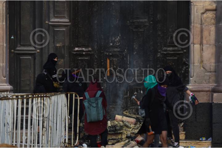 Feministas Radicales llegaron a la Cámara de Diputados del Estado de México en protestaron, martillaron las puertas principales y prendieron fuego a pancartas y unos muñecos.