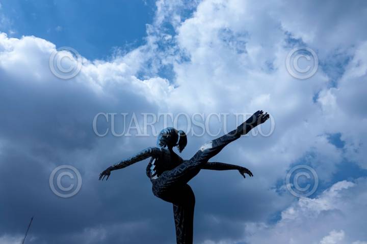 CIUDAD DE MÉXICO, 09SEPTIEMBRE2025.- La escultura de acero inoxidable titulada “Pavlova” del escultor mexicano Pablo Fierro, expuesta en el patio de la Cámara de Diputados, luce contrastada entre nubes durante la tarde de este martes. FOTO: GALO CAÑAS/CUARTOSCURO.COM