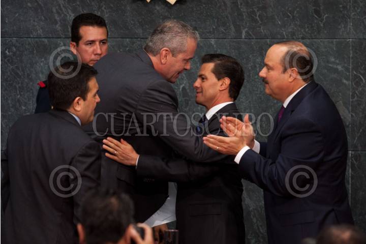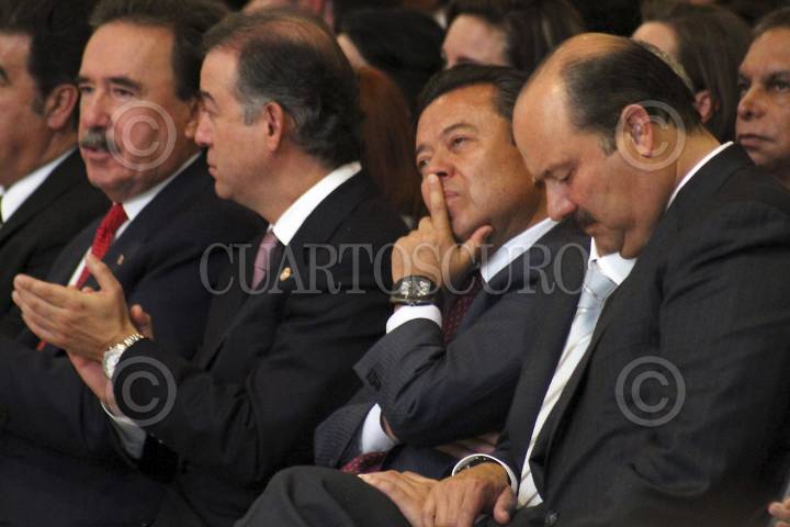 TLAXCALA, TLAX, 14ENERO2014.- (izq.) Emilio Gamboa Patrón, senador de la República y lider de la bancada del PRI; Raúl Cervantes, lider del senado; César Camacho, dirigente nacional del PRI, y el gobernador de Chihuahua, César Duarte Jáquez, durante la ceremonia del 3er Informe de gobierno de Mariano González Zarur, gobernador del estado. El evento se llevó a cabo en las instalaciones del centro de convenciones de la capital del estado. FOTO: J. GUADALUPE PÉREZ /CUARTOSCURO.COM