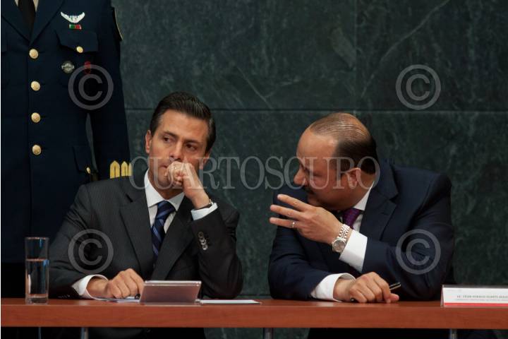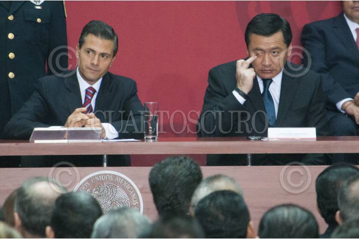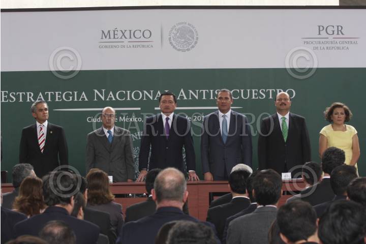 MÉXICO, D.F., 28ENERO2014.- Miguel Ángel Mancera, Jefe de Gobierno, Jesús Murillo Karam, Procurador General de la República, Miguel Ángel Osorio Chong, Secretario de Gobernación, Rafael Moreno Valle, gobernador de Puebla, César Duarte Jáquez, gobernador de Chihuahua, e Isabel Miranda de Wallace, durante la presentación de la estrategia nacional antisecuestro en la sede de la SEGOB. FOTO: CUARTOSCURO.COM
