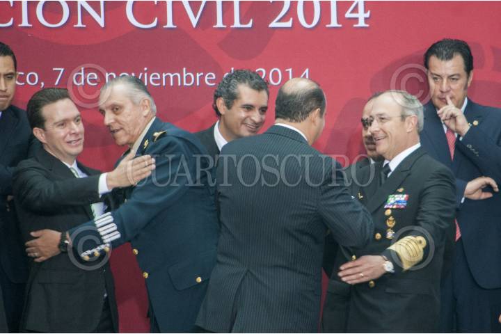 MÉXICO, D.F., 07NOVIEMBRE2014.- Luis Felipe Puente Espinosa, coordinador nacional de Protección Civil; Vidal Soberón Sanz, secretario de Marina; Miguel Barbosa Huerta, senador del PRD; Enrique Peña Nieto, presidente de México; Miguel Ángel Osorio Chong, secretario de Gobernación, y Salvador Cienfuegos, secretario de la Defensa Nacional, durante la entrega del Premio Nacional de Protección Civil realizado en el patio de honor del Palacio Nacional. FOTO: DIEGO SIMÓN SÁNCHEZ /CUARTOSCURO.COM