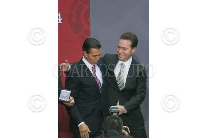 MÉXICO, D.F., 07NOVIEMBRE2014.- Enrique Peña Nieto, presidente de México, y Manuel Velasco Coello, gobernador de Chiapas, durante la entrega del Premio Nacional de Protección Civil realizado en el patio de honor del Palacio Nacional. FOTO: DIEGO SIMÓN SÁNCHEZ /CUARTOSCURO.COM