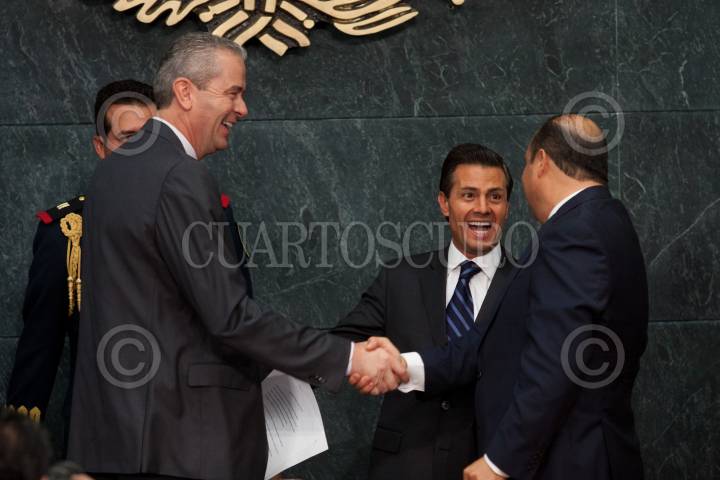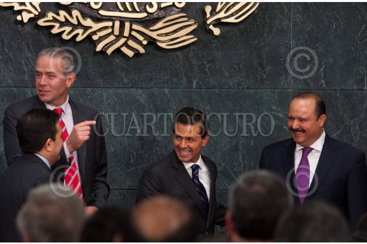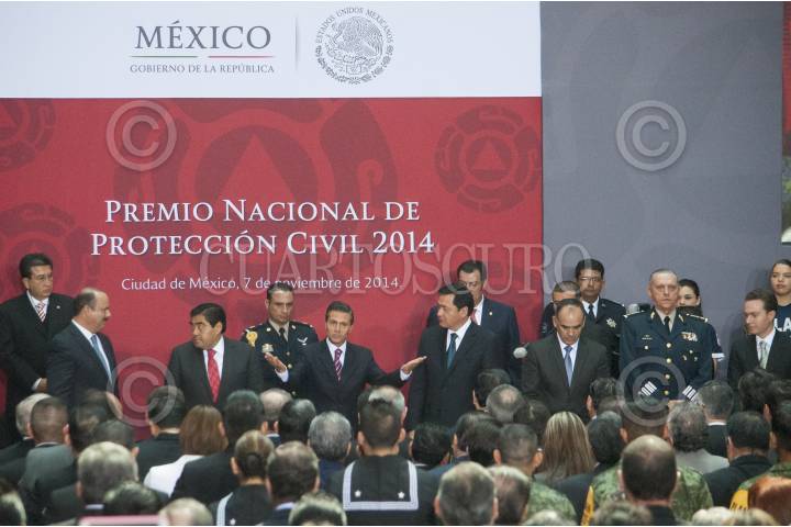 MÉXICO, D.F., 07NOVIEMBRE2014.- César Duarte Jáquez, gobernador de Chihuahua; Miguel Barbosa Huerta, senador del PRD; Enrique Peña Nieto, presidente de México; Miguel Ángel Osorio Chong, secretario de Gobernación; Luis García Moreno, de Protección Civil de Chiapas; Salvador Cienfuegos, secretario de la Defensa Nacional, y Manuel Velasco Coello, gobernador de Chiapas, durante la entrega del Premio Nacional de Protección Civil realizado en el patio de honor del Palacio Nacional. FOTO: DIEGO SIMÓN SÁNCHEZ /CUARTOSCURO.COM