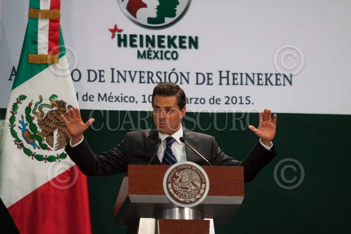 MÉXICO, D.F, 10MARZO2015.- Marc Busain, CEO Cuauhtémoc Moctezuma Heineken México, Enrique Peña Nieto, Presidente de México, Ildefonso Gaajardo, secretario de Economía y César Duarte Jáquez, gobernador de Chihuahua, durante el anuncio de inversión de Heineken en nuestro país de 7 mil 350 millones de pesos el cual se destinará a la construcción de una nueva planta cervecera en Meoqui, Chihuahua. FOTO: MOISÉS PABLO /CUARTOSCURO.COM