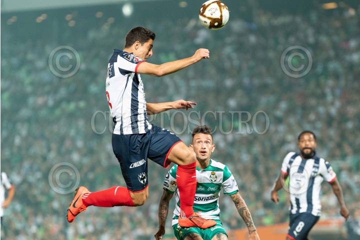 TORREÓN, COAHUILA, 01DICIEMBRE2019.- Los Santos se enfrentan a los Rayados del Monterrey, en el Estado Corona, el parido se encuentra empatado a un gol, por los locales anotó Brian Lozano y por los regios Vincent Janssen, con este marcador los visitantes lograrían su pase a las semifinales de la Liga MX, ya que los de Monterrey se impusieron 5-2 en el primer partido, global al momento 6-3. En la imagen César Montes, defensa de los Rayados, despeja un balón con la cabeza- FOTO: ROGELIO CUEVA /CUARTOSCURO.COM