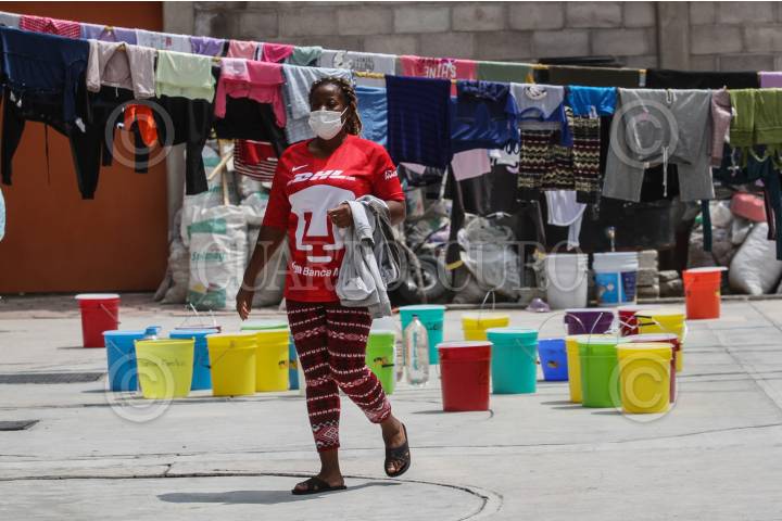 Mujer camina entre ropa y cubetas en el albergue CAFEMIN.