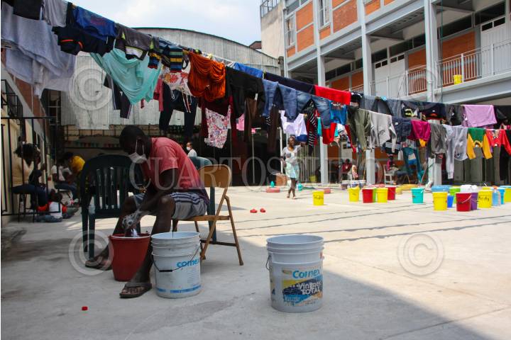 Hombre lava ropa en el patio del albergue CAFEMIN.