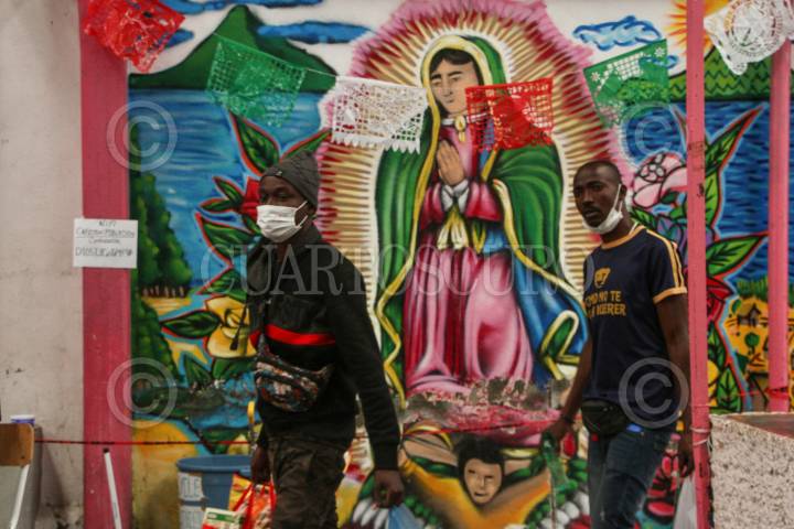 Dos hombres caminan frente a mural de la Virgen en el albergue CAFEMIN.