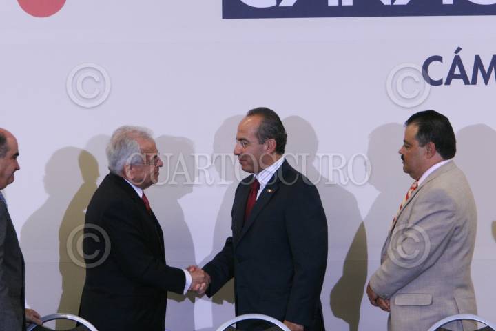 MEXICO, D.F., 29OCTUBRE2008.- Felipe Calderón Hinojosa, Presidente de México, tomo protesta a los nuevos integrantes de la Cámara Nacional del Autotransporte de Carga en el marco de su XIX Asamblea General Ordinaria que se realizó en el Centro de Exposiciones Bancomer. En la imagen es acompañado por Jorge Cárdenas Romo, quien rindio protesta como nuevo presidente de la CANACAR. FOTO: CUARTOSCURO.COM