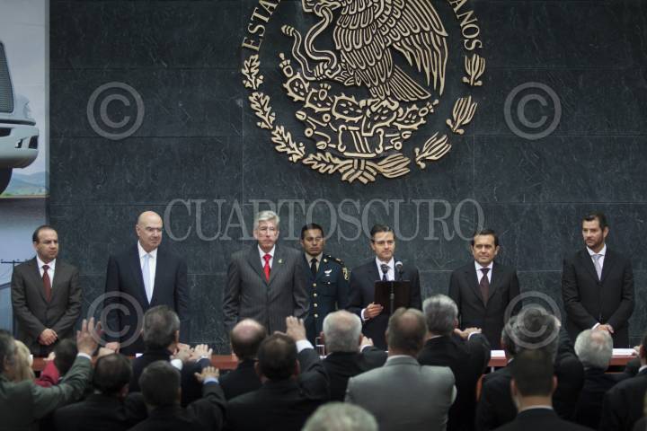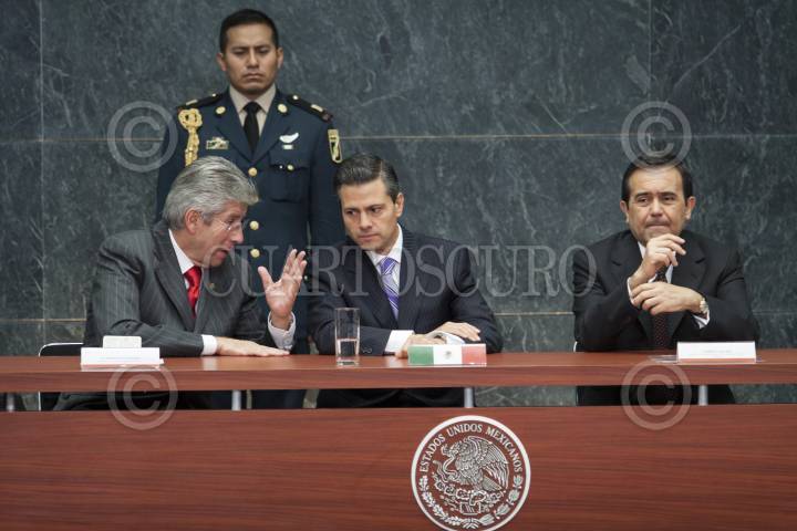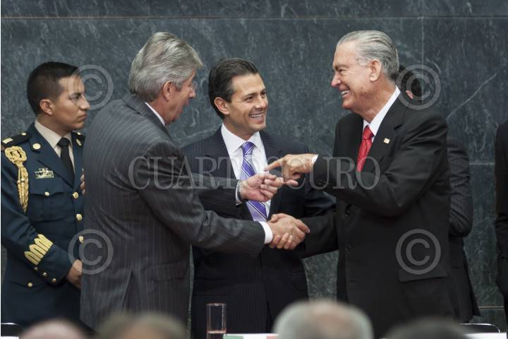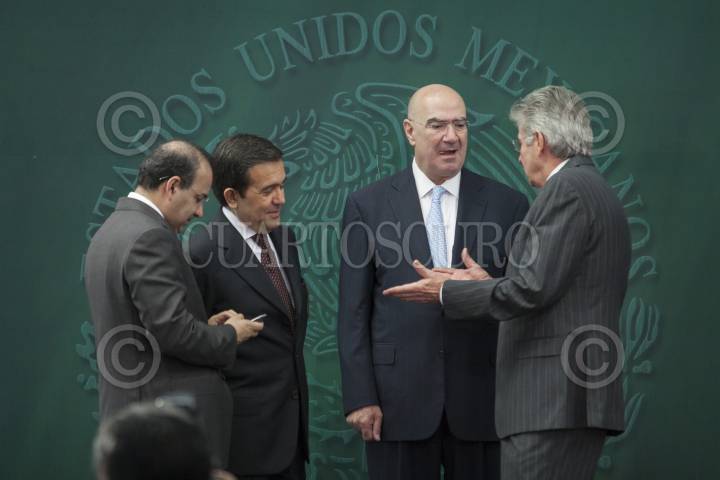 MÉXICO D.F., 29AGOSTO2013.- Los secretarios del Trabajo, Alfonso Navarrete Prida; de Economía, Ildefonso Guajardo; de Medio Ambiente, José Guerra Abud y de Comunicaciones y Transportes, Gerardo Ruíz Esparza durante el evento de Toma de Protesta al Consejo Nacional Directivo de la Cámara Nacional del Autotransporte de Carga (CANACAR) que se realizó en el salón Adolfo López Mateos de la Residencia Oficial de Los Pinos. FOTO: RODOLFO ANGULO /CUARTOSCURO.COM