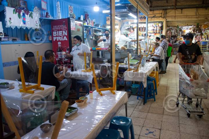 Un negocio de comida en el Mercado Jamaica, adapto sus mesas para dividir a sus comensales.