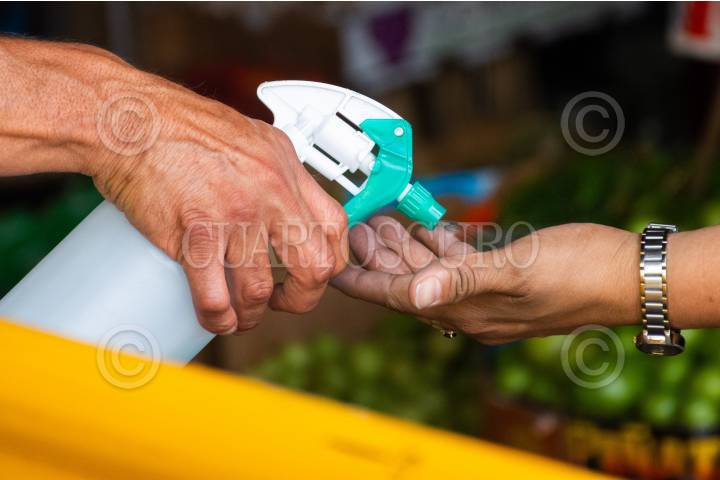 En la entrada del Mercado Jamaica se ofrece gel antibacterial a los visitantes para poder ingresar.