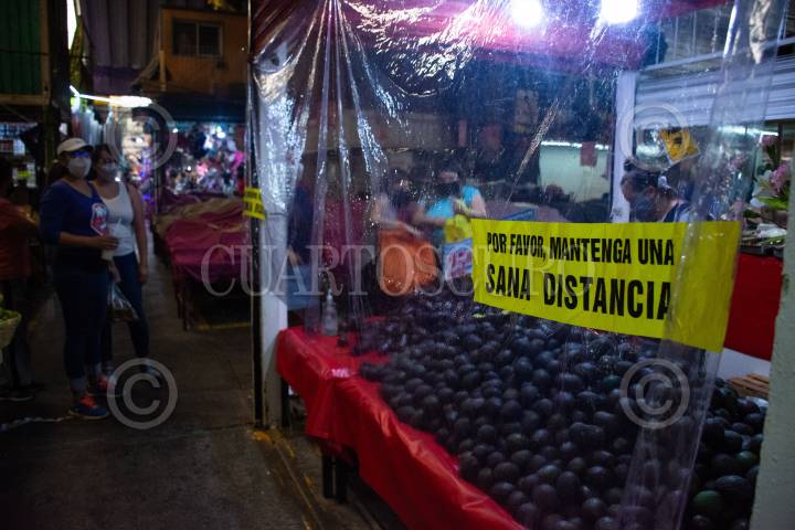 Un local del Mercado Jamaica colocó plastico para separar a los clientes de su producto y a la vez, solicita mantener sana distancia para poder ser atendidos.