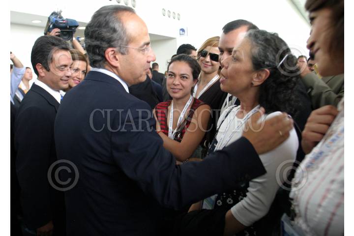 MÉXICO, D.F., 18ABRIL2007.- Felipe Calderón Hinojosa, Presidente de los Estados Unidos Mexicanos saludo a la actriz Luisa Huertas y Giovanna Zacarias, quienes actualmente trabajan en la serie Capadoccia de HBO, durante su platica Huertas le pidió apoyo para el teatro al finalizar la inauguración Expo Convención CANITEC 2007 en el Centro Banamex. FOTO: MOISÉS PABLO/CUARTOSCURO.COM