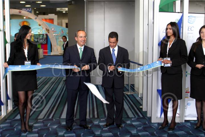 MÉXICO, D.F., 18ABRIL2007.- Felipe Calderón Hinojosa, Presidente de los Estados Unidos Mexicanos y Alejandro Puente, presidente de a Cámara Nacional de la Industria de Telecomunicaciones por Cable, cortaron el listón inaugural de la Expo Convención CANITEC 2007 en el Centro Banamex. FOTO: MOISÉS PABLO/CUARTOSCURO.COM