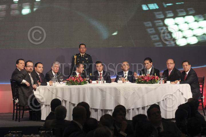 MÉXICO, D.F., 18ABRIL2007.- Jorge Zermeño, diputado federal, Alejandro Alvarez Guerrero, Alejandro Puente, presidente de la Cámara Nacional de la Industria de Telecomunicaciones por Cable, Felipe Calderón Hinojosa, Presidente de los Estados Unidos Mexicanos, Mariano Azuela Huitron, ministro dela SCJN y Josefina Vázquez Mota, Secretaría de la SEP, durante la comida inaugural de la Expo Convención CANITEC 2007 en el Centro Banamex. FOTO: MOISÉS PABLO/CUARTOSCURO.COM