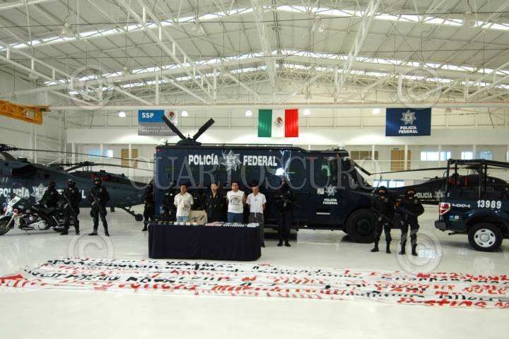 MÉXICO, D.F., 18MARZO2010.- Francisco Javier Carmona Rangel, alías el M60, fue presentado como presunto jefe de plaza en distintos municipios del Estado de México y vinculado con la organización delictiva de “La Familia Michoacana”, en compañía de cuatro personas más. Los detenidos fueron asegurados como presuntos responsables de por lo menos ocho secuestros, siete homicidios, así como atentados contra policías y actividades de narcomenudeo. Reportes de inteligencia señalan que los detenidos fungían como grupo de choque contra otras organizaciones delictivas. Cabe señalar que estas personas están relacionadas con los hechos registrados el pasado 11 de enero del presente en el Estado de México, cuando se enfrentaron contra policías federales y del municipio de Tultitlán. Durante la agresión los presuntos delincuentes lanzaron granadas desde un restaurante, privando de la vida a un policía municipal y a un civil, logrando escapar con dos rehenes. FOTO: LUIS CARBAYO/CUARTOSCURO.COM