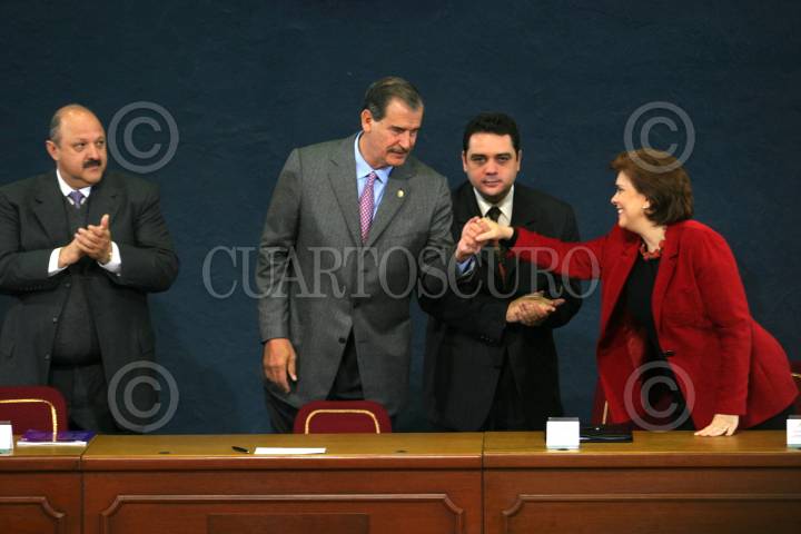 MEXICO, D.F. 16DICIEMBRE2004.- Reyes Tamez, Secretario de Educación Pública; Vicente Fox, Presidente de la República; Cristian Castañón Contreras, director general del Instituto Mexicano de la Juventud y Sari Bermudez, titular de CONACULTA, durante la ceremonia de entrega del Premio Nacional de la Juventud, en la residencia oficial de los Pinos. FOTO: Nelly Salas/CUARTOSCURO.COM