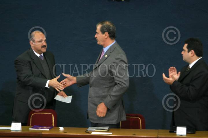 MEXICO, D.F. 16DICIEMBRE2004.- Reyes Tamez Guerra, secretario de Educación Pública; Vicente Fox, Presidente de la República; Cristian Castañón Contreras, director general del Instituto Mexicano de la Juventud y Sari Bermudez, titular de CONACULTA, durante la ceremonia de entrega del Premio Nacional de la Juventud, en la residencia oficial de los Pinos. FOTO: Nelly Salas/CUARTOSCURO.COM