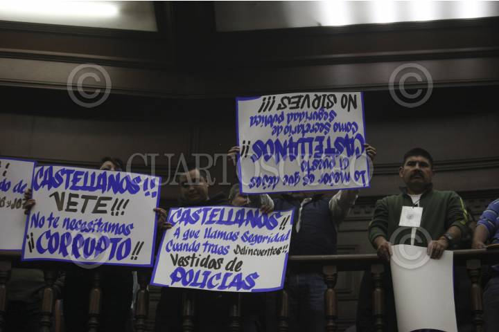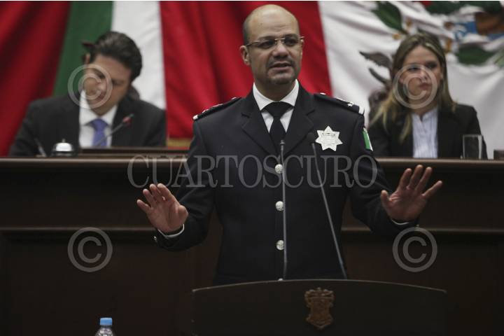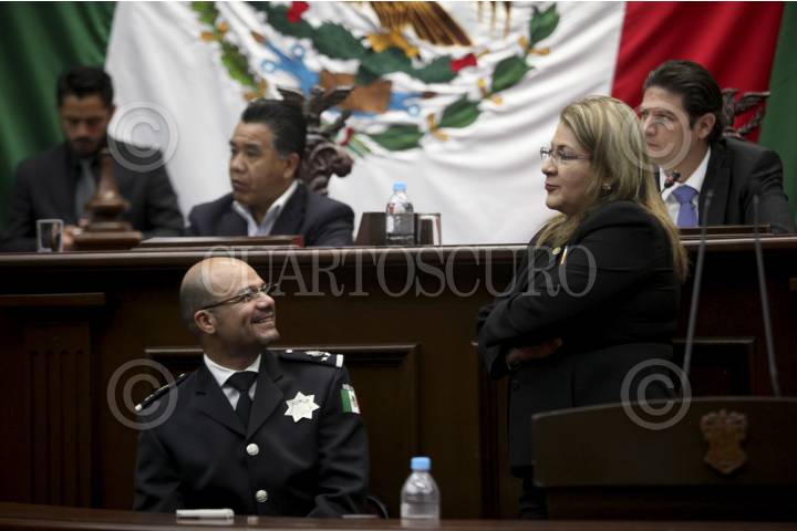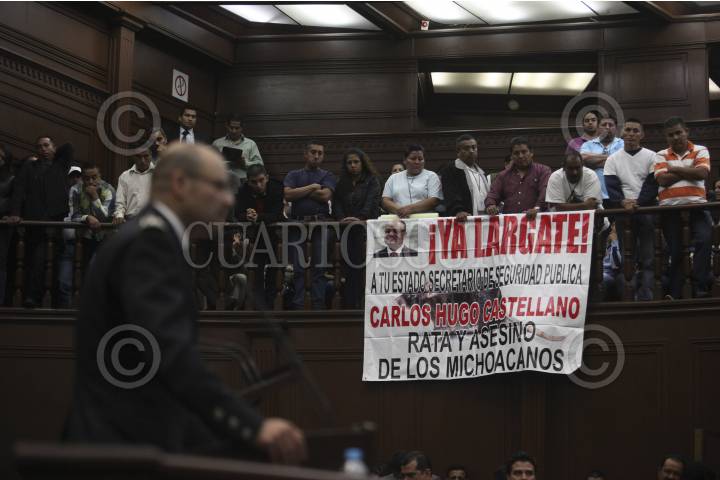 MORELIA, MICHOACÁN, 14OCTUBRE2014.- El Secretario de Seguridad Publica del estado, Carlos Hugo Castellanos, compareció este martes ente el pleno del Congreso del Estado, para darles a conocer a los legisladores los avances en esta materia en la entidad. En el recinto estuvieron presentes la mayoría de los diputados locales y se apresuró el fin de la comparecencia por el posible arribó de estudiantes normalistas al recinto legislativo. FOTO: ALAN ORTEGA / CUARTOSCURO.COM