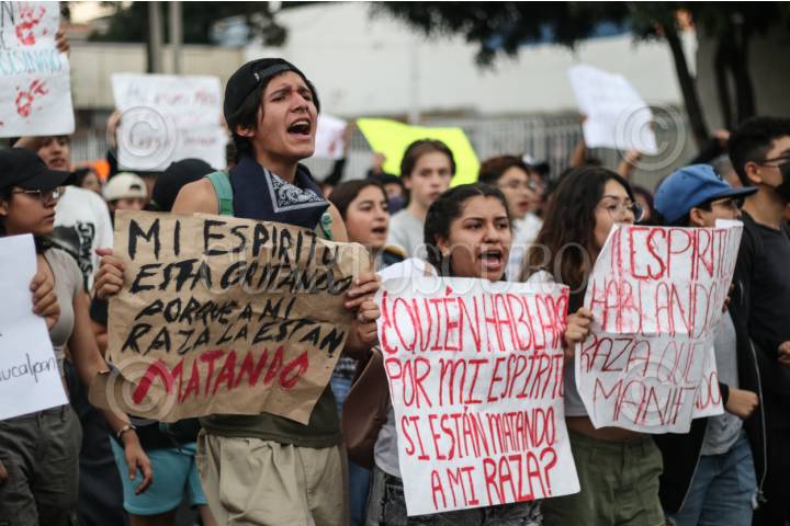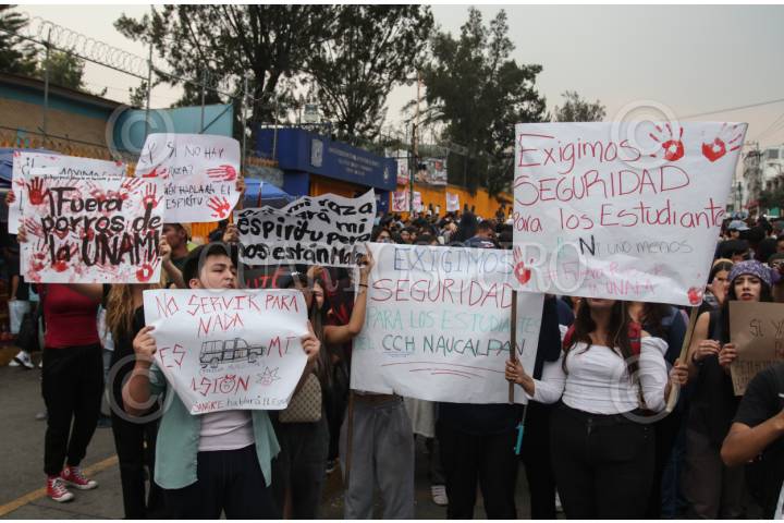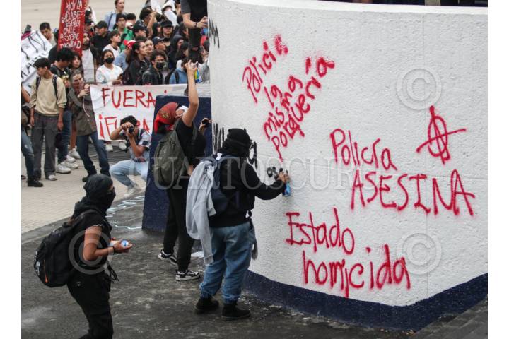 NAUCALPAN, ESTADO DE MÉXICO, 13MAYO2024.- Estudiantes del plantel Colegio Ciencias de Humanidades plantel Naucalpan (CCH Naucalpan) luego de asamblea estudiantil marcharon hacía el Palacio Municipal donde realizaron algunas pinta y mitin exigiendo a los porros fuera de la UNAM. FOTO: ANDREA MURCIA /CUARTOSCURO.COM
