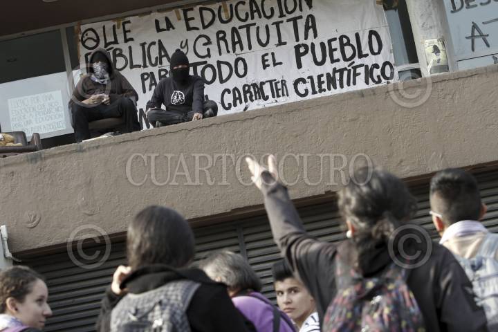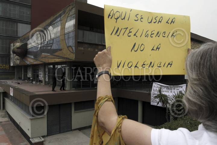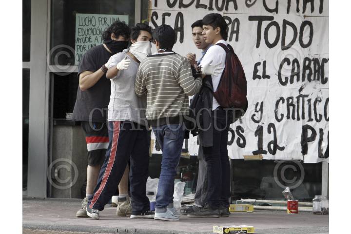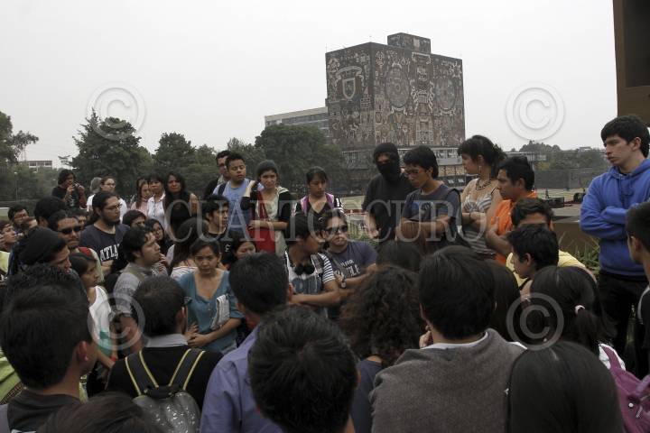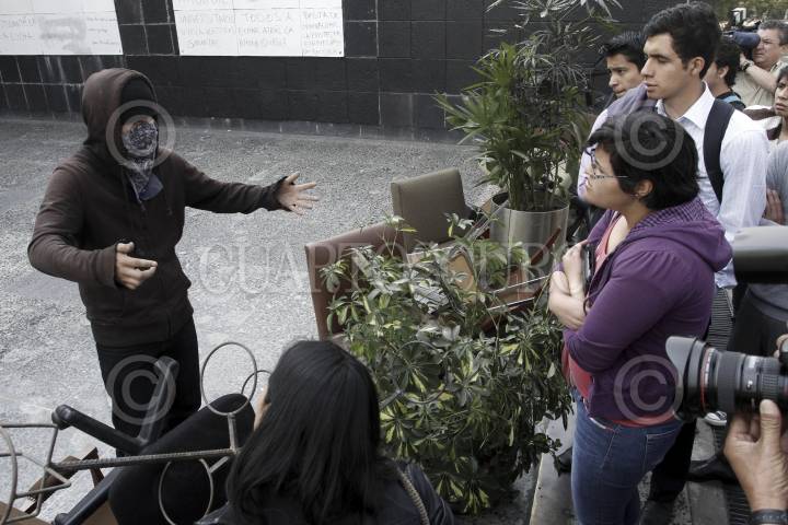MÉXICO, D.F., 23ABRIL2013.- Estudiantes cuestionaron a los jóvenes que tomaron la Rectoría de la UNAM sobre sus razones para llevar a cabo tales actos. Desde el pasado viernes un grupo de jóvenes con el rostro cubierto tomó estas instalaciones en demanda de la reinstalación de cinco estudiantes del CCH Naucalpan, quienes fueron expulsados temporalmente luego de un enfrentamiento con trabajadores de ese plantel a principios de febrero. FOTO: ISAAC ESQUIVEL /CUARTOSCURO.COM