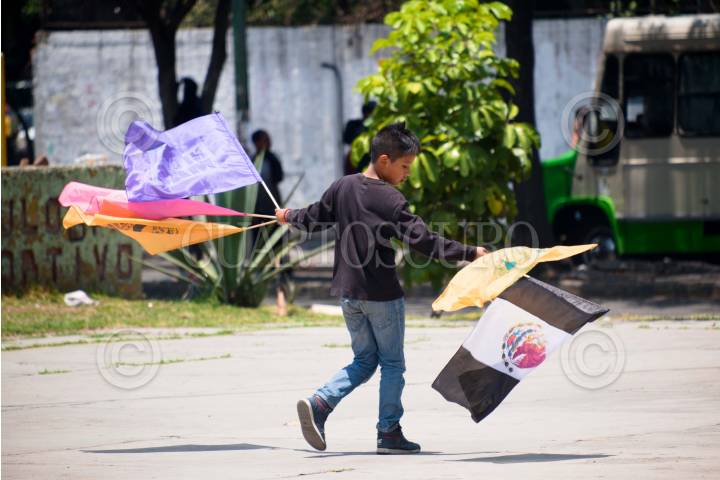 CIUDAD DE MÉXICO, 02MAYO2019.- Niño vende banderas de México y de la UNAM, en la entrada del CCH Oriente. De acuerdo al Módulo sobre Trabajo Infantil, menores de 14 años del 12.5% de la población infantil trabaja. FOTO: GRACIELA LÓPEZ /CUARTOSCURO.COM