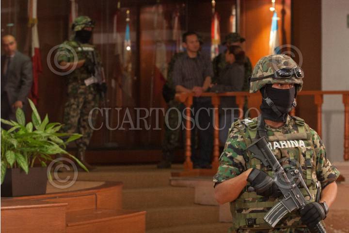 MÉXICO, D.F. 08OCTUBRE2012.- Custodia de elementos de la Marina Armada de México durante la presentación de Salvador Martínez Escobedo o Carlos García, alias "La Ardilla", presentado por la SEMAR. FOTO: JUAN PABLO ZAMORA /CUARTOSCURO.COM