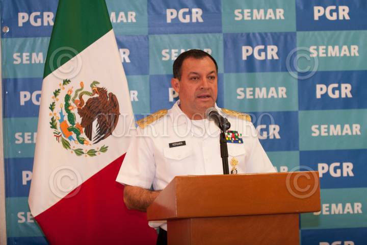 MÉXICO, D.F. 08OCTUBRE2012.- , El vicealmirante José Luis Vergara, vocero de Marina, durante la presentación de Salvador Martínez Escobedo, alias "La Ardilla", presunto autor de más de 300 muertes en Tamaulipas e identificado como uno de los presuntos homicidas de los 72 migrantes en San Fernando, Tamaulipas. Se le acusa además de dos fugas masivas en Coahuila y Tamaulipas. FOTO: JUAN PABLO ZAMORA /CUARTOSCURO.COM